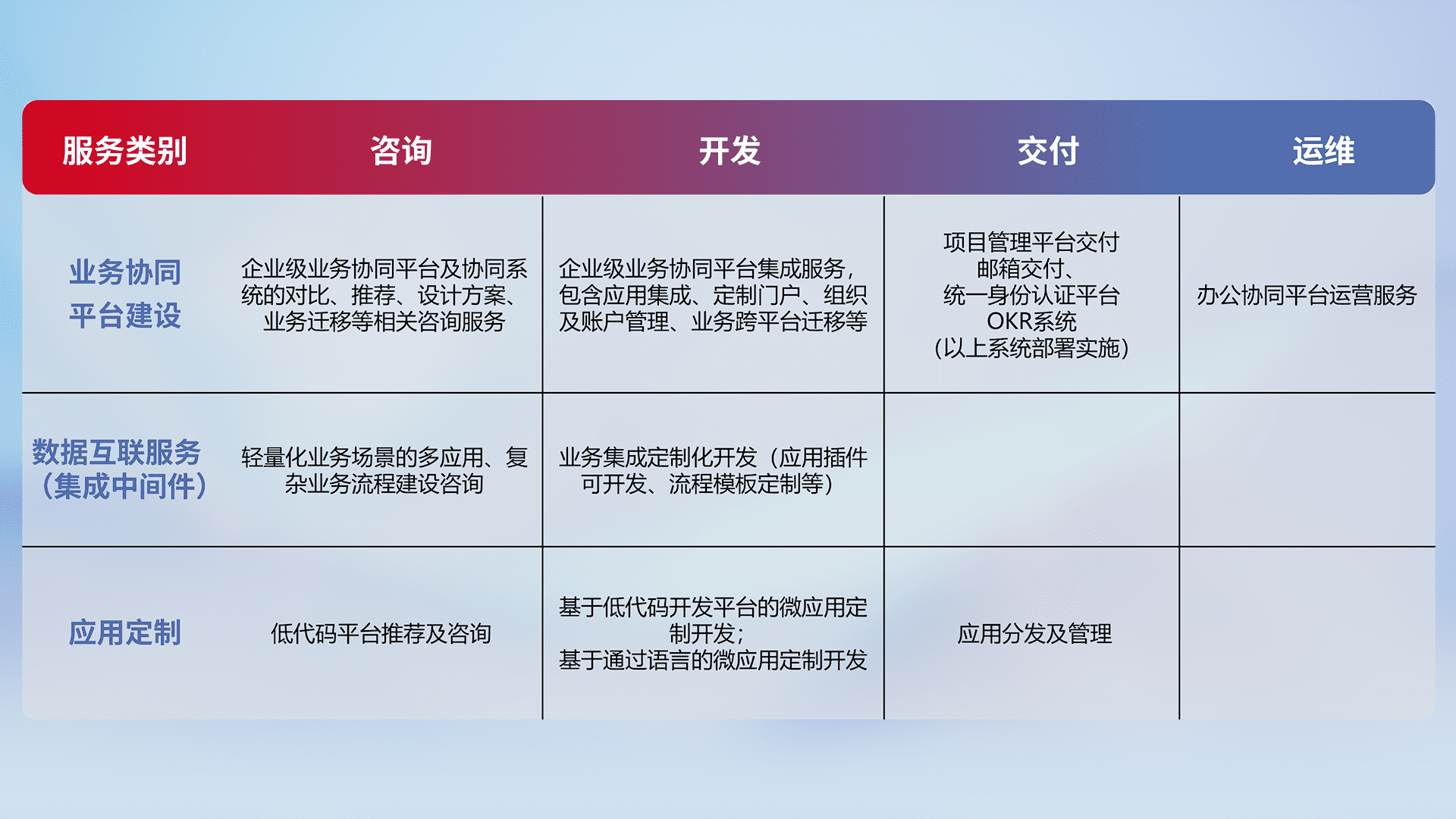 针对钉钉、、企微、、IDaas等平台级产品提供产品的规划、、、、方案、、交付、、、定制化开发等服务,,,实现如统一协同办公、、智能客户服务、、、、混合会议管理、、、智能数据查询、、、、等业务场景,,,,实现数字化转型。。