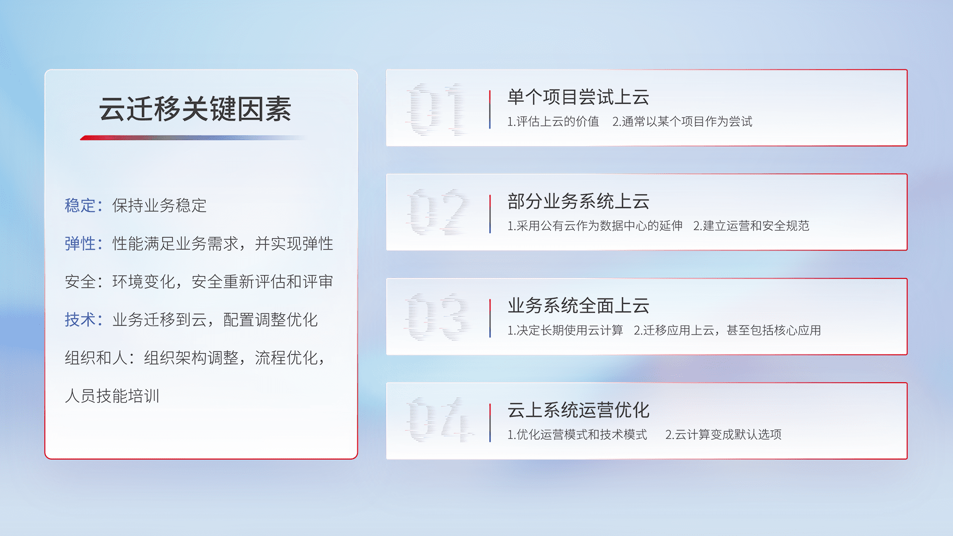 结合实际业务,,,,从规划设计、、、、云平台选型、、、云原生改造、、数据迁移、、、集成交付,,,,迁移全过程为客户识别最佳上云路径,,,做好风险识别管理,,,设计网络架构、、、、身份权限、、、、安全审计合规、、操作审计、、日志审计、、监控告警策略、、多站点容灾设计等,,,对云上基础设施进行整体规划,,,提升IT治理水平,,,以满足弹性、、高可用、、、高性能的需求。。。。
