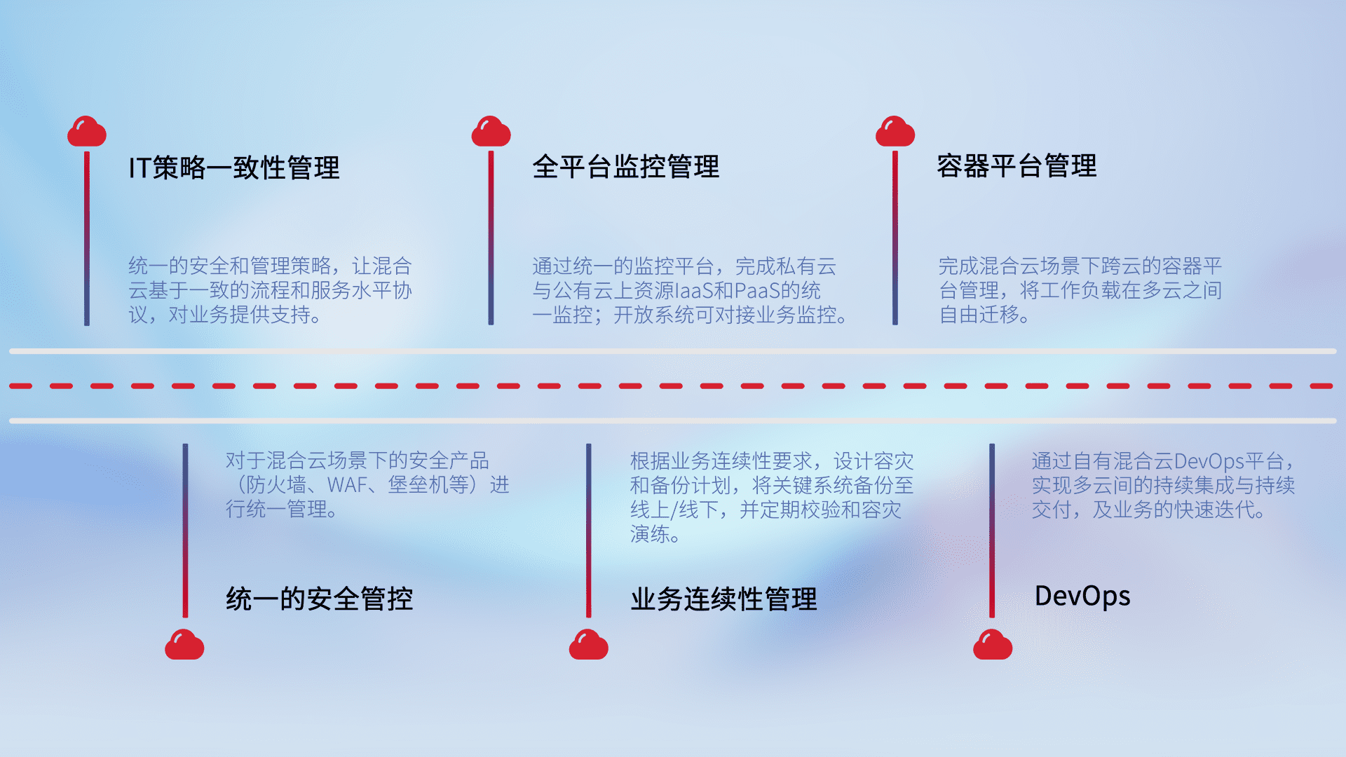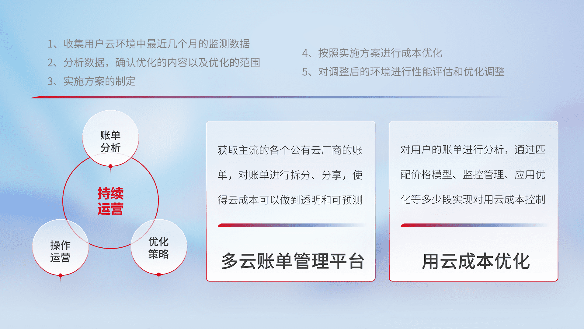 通过多云纳管,,,以统一的资源数据模型把客户的云资源进行抽象和封装,,,,进而实现对多云资源的统一操作,,,,保障云资源管理的可靠性、、、、稳定性与可用性。。量身定制化运维内容,,,,配置、、、开发运维、、、补丁管理、、备份、、、、监控、、、、认证和访问管理、、审计和日常巡检等,,,,保障在用云过程中的可靠度,,,稳定度以及高可用率。。